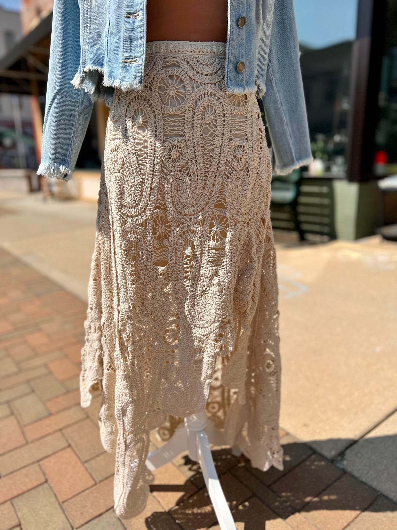 Elevate your wardrobe with this crochet lace waist high-low maxi skirt, expertly designed for timeless elegance and comfort. The intricate crochet lace waistband adds delicate detail, while the high-low hem provides a flattering silhouette that moves gracefully. Crafted to complement both casual and dressier outfits, this skirt offers versatility with a refined, artisanal touch perfect for sophisticated styling.