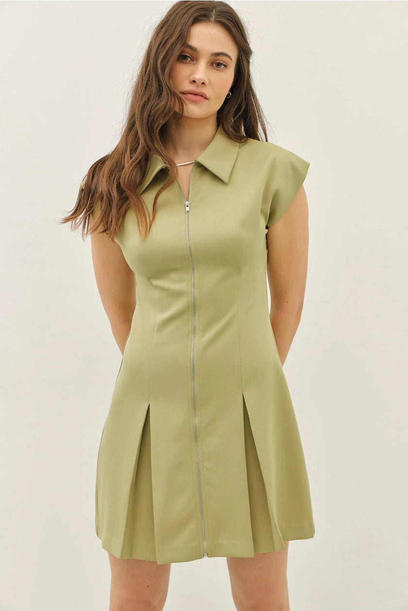 Features - Stretchy fabric - Mini dress - Front zipper closure - Pleated hem - Sleeveless - Collared neck