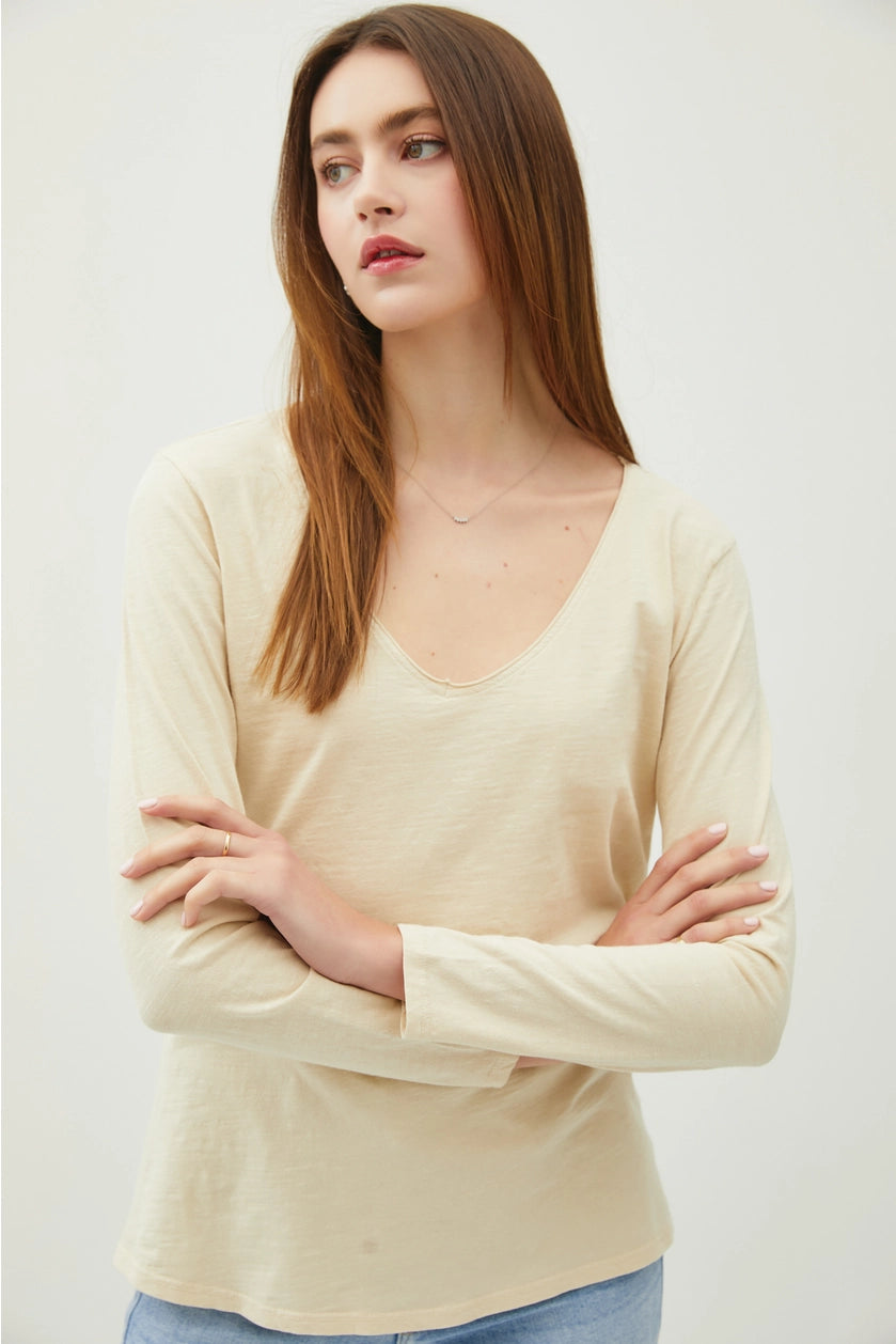 Effortless comfort meets everyday style with this lightweight cotton v-neck long sleeve tee. Crafted from soft, breathable cotton, it features a relaxed fit that skims the body without clinging, hitting right at the hip for a flattering silhouette. The classic v-neckline and long sleeves make it versatile enough to layer or wear solo. Perfect as a wardrobe staple that transitions seamlessly from casual days to layered looks.