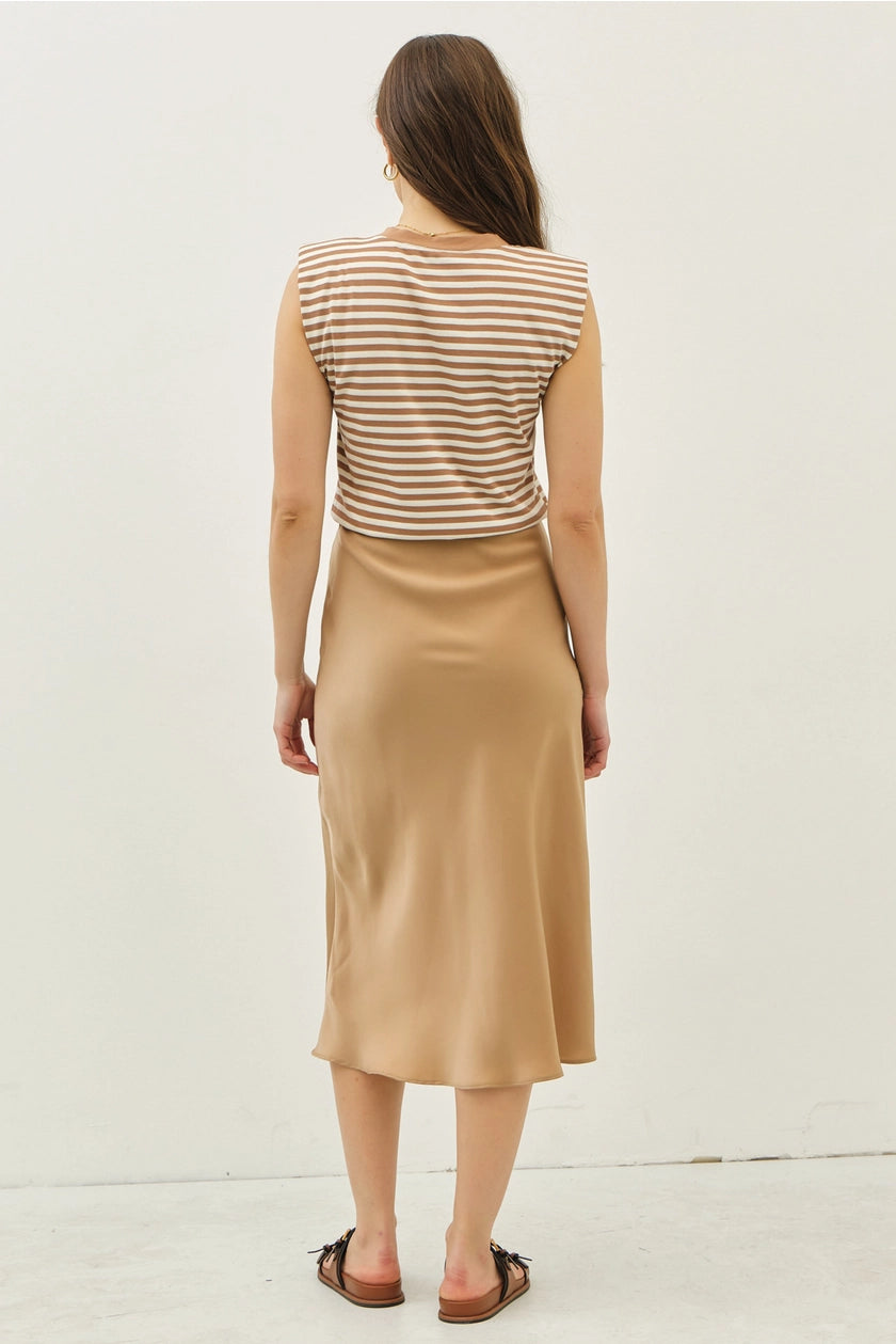 Midi-length A-line dress featuring a striped knit top and satin bias-cut skirt