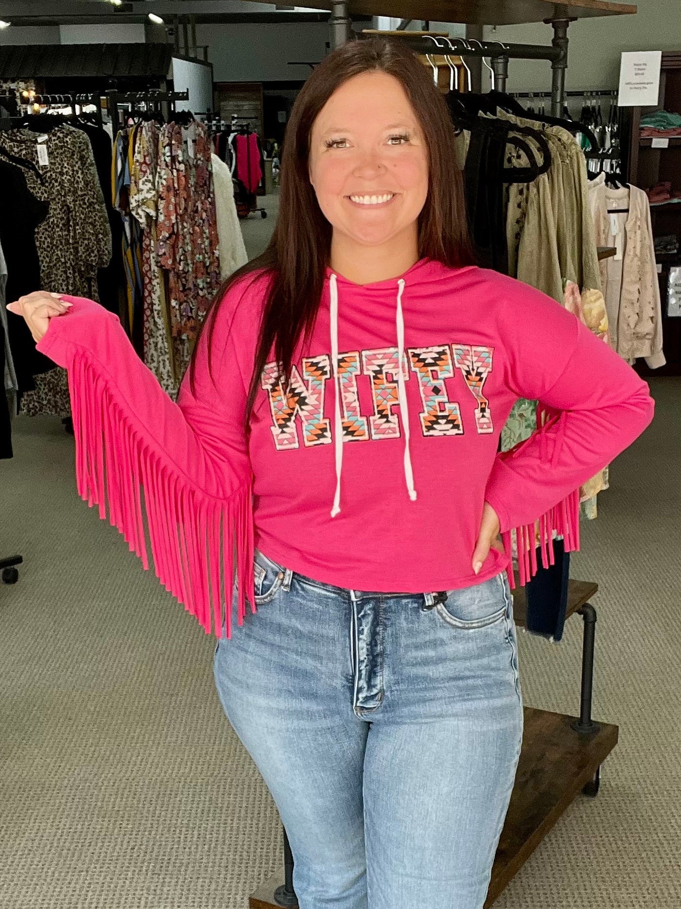 Embrace Western charm with this striking hooded fringe top, designed for those who appreciate bold statement pieces. The graphic detailing adds personality while the fringe trim delivers authentic frontier flair. Perfect for layering over basics or wearing solo, this versatile piece transitions seamlessly from casual outings to weekend adventures. The comfortable hood provides practical style, making it an essential addition to any wardrobe that celebrates rustic, independent spirit.