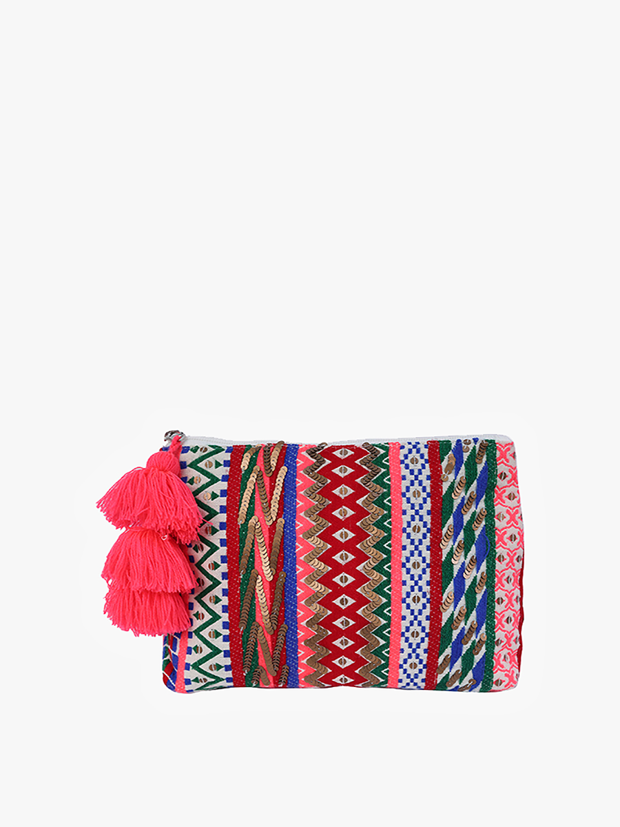 -Printed cosmetic case/pouch -Decorative tassel top zipper -Side loops/handles -Made of cotton Dimensions: -Length: 8.5 inches -Height: 6.5 inches -Depth: 4 inches