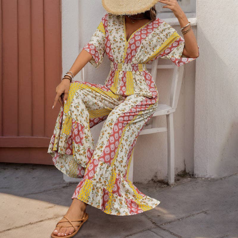 • Features: abstract print, molded waistband, v-neck, short sleeves, high waist, women's casual wide leg jumpsuit.