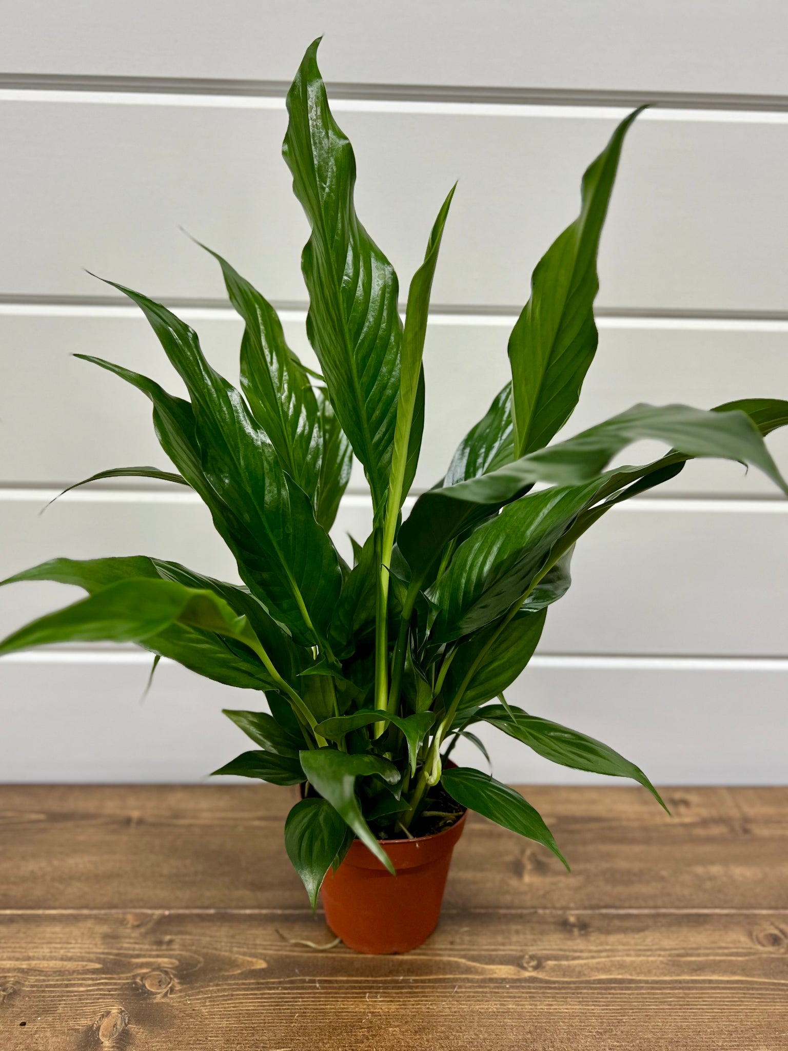 Peace lilies thrive in bright, indirect light and warm, humid conditions making them ideal houseplants. Keep soil consistently moist but not waterlogged, watering when the top inch of soil is dry. They are dramatic and will droop when thirsty, but usually revive quickly. Avoid direct sun to prevent leaf scorch.