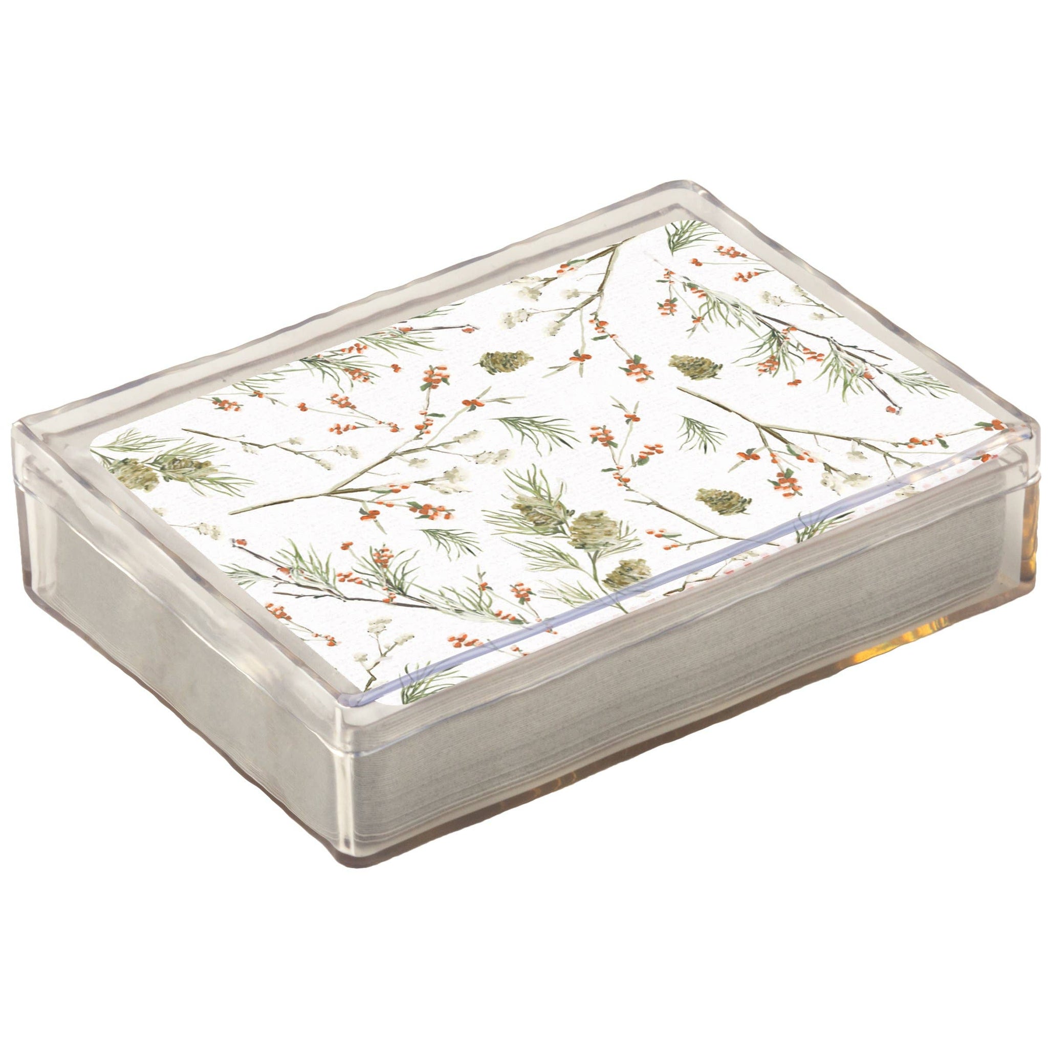 A 54-card playing deck from our Christmas Collection displaying charming designs of winter birds on each card as well as a pattern of winter greenery on the backs. Winter designs are replicated from original art hand painted in a unique watercolor style. Our Winter Birds playing cards are packaged in a protective acrylic case for easy storage when not in use or traveling. A nature-themed Christmas gift perfect for on the go games.