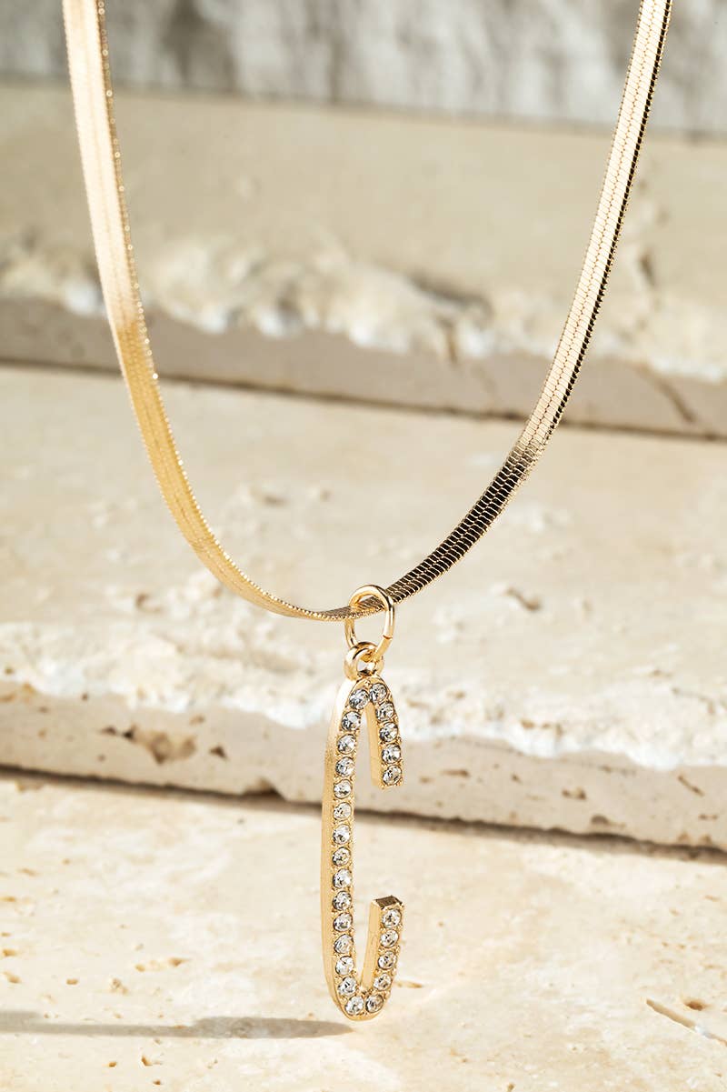 Beautiful brass initial pendant with pave crystals on a luminous snake chain necklace.