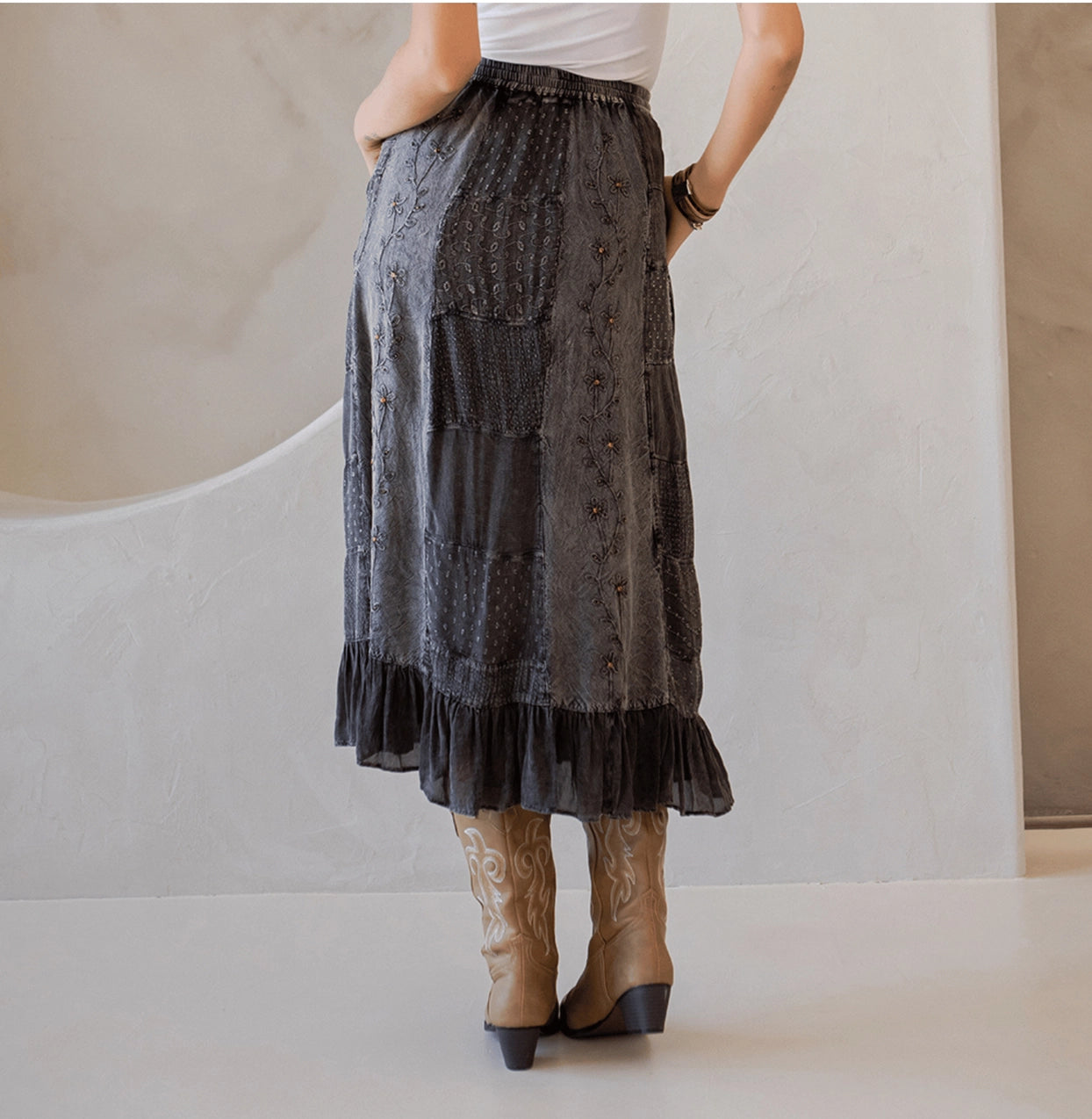 Women Western Skirt patchwork with embroidery and ruffled hem, crinkled overdyed and stone washed, as these are hand dyed there may be slight color variation from the picture, they have draw strings, elasticated waist and 2 pockets, made from rayon and multiple textured Georgette crepe fabric. -Due to nature of patchwork we use similar prints by which print design and print placement may vary as compared to shown image -Most of our garments are hand overdyed and there may be variation in color as compared to shown image. Disclaimer: Patches will vary between pieces, creating a unique look.