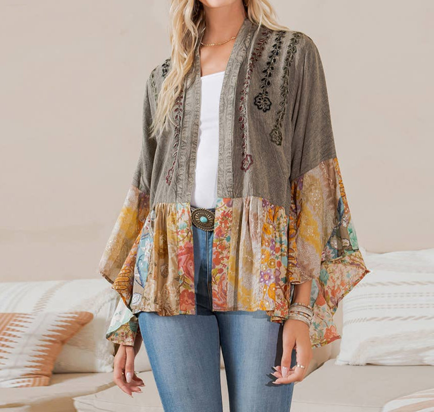 • Style: Kimono-style shrug blending traditional and contemporary elements • Material: Cotton-blended fabric for durability and comfort • Embroidery: Intricate patchwork on lapels, bell sleeves, and flares • Design: Patchwork lapels, bell sleeves, and flares for a bohemian touch • Length: Hits at the hip for a flattering fit • Texture: Overdyed texture with a vintage appeal • Styling: Pair with jeans or dresses, accessorize for a boho-chic look